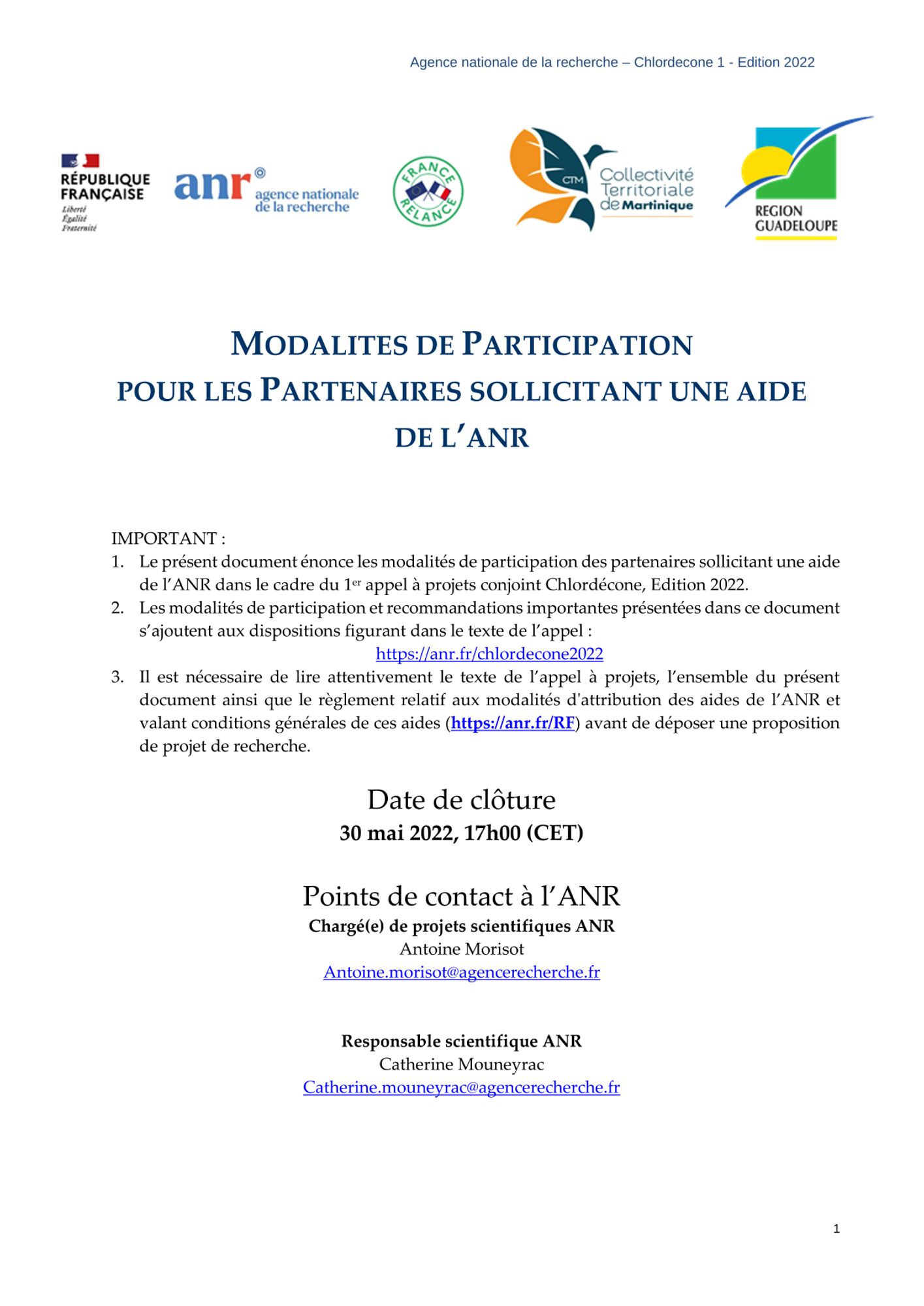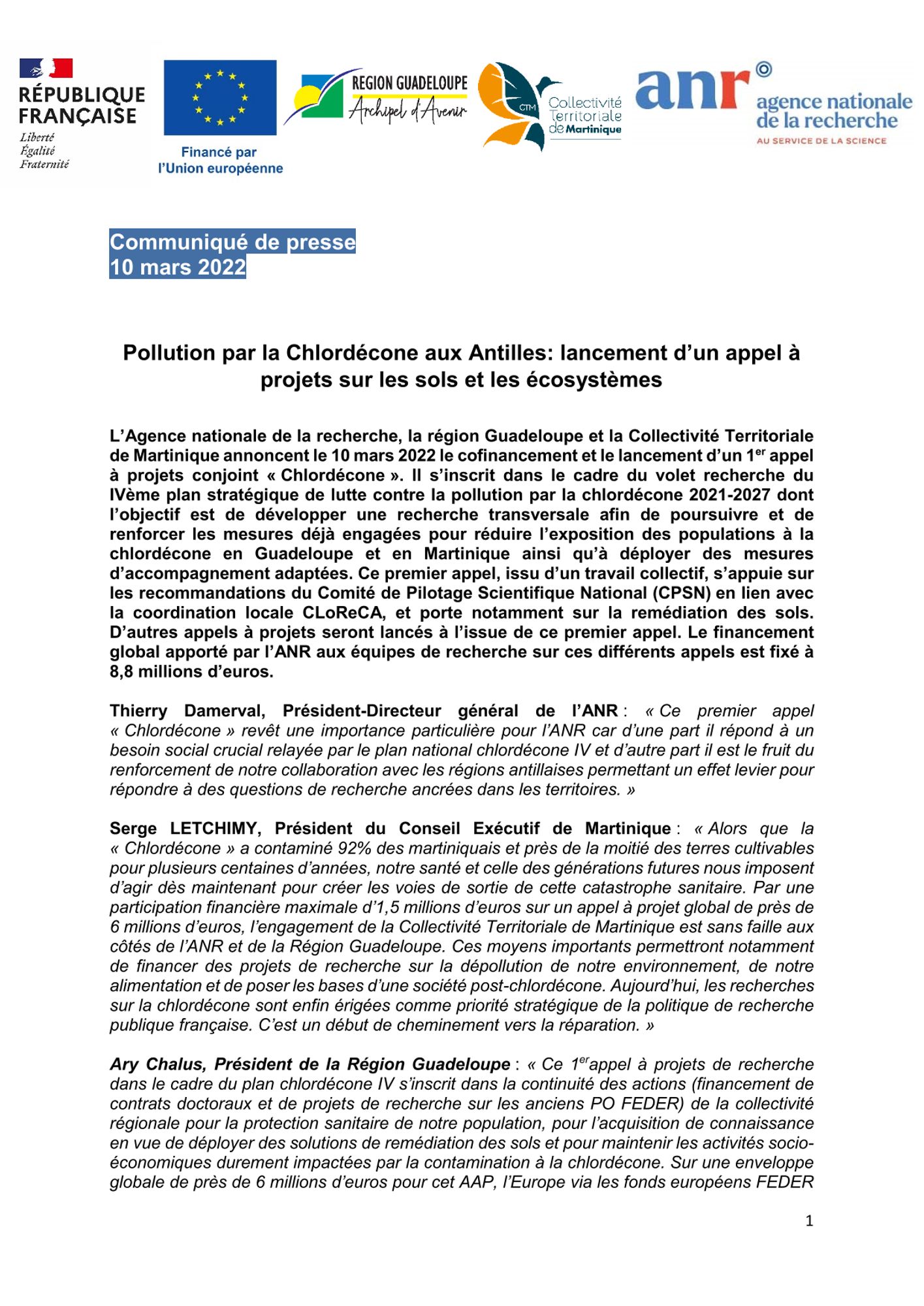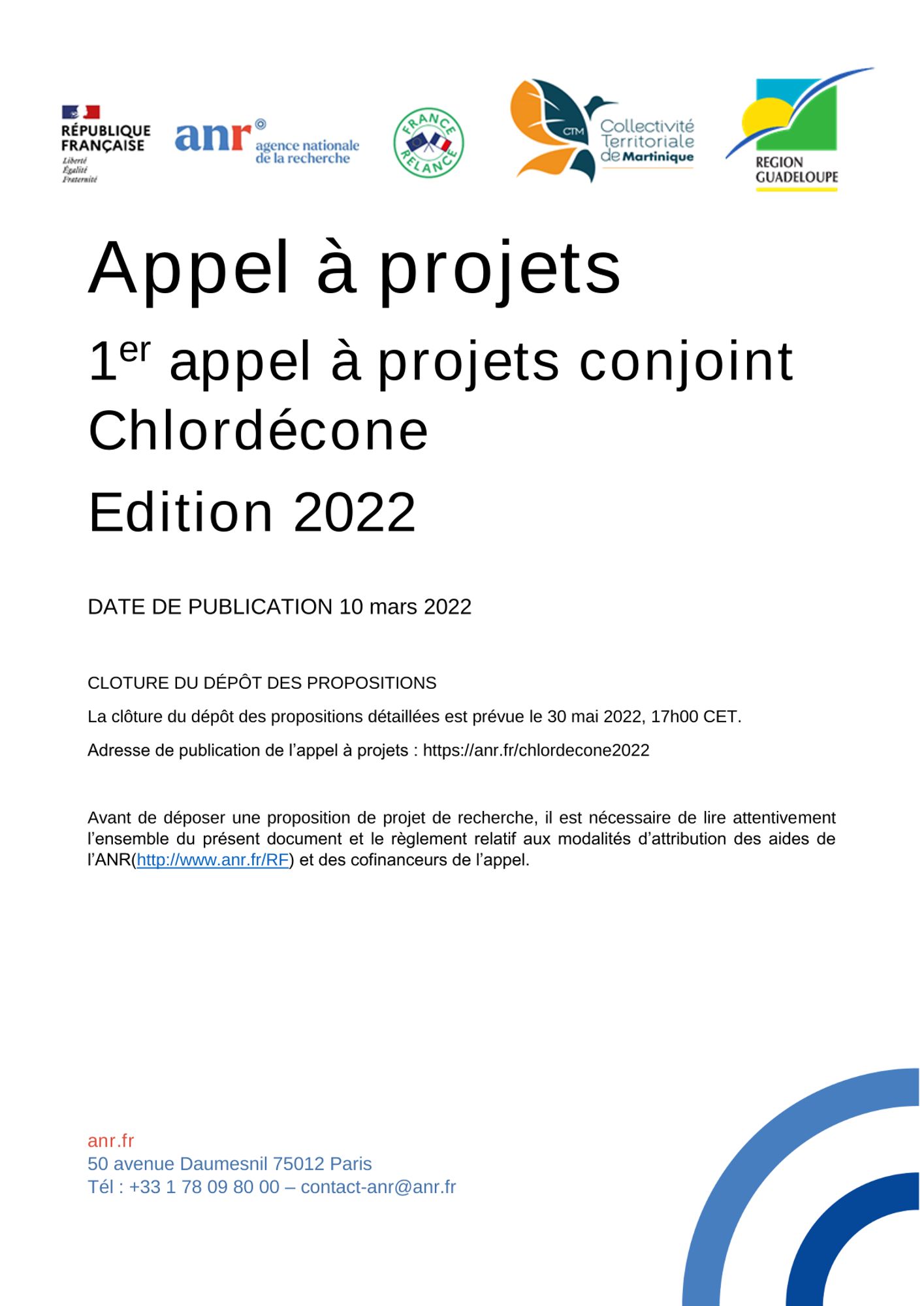 L'Agence nationale de la recherche (ANR), la Région Guadeloupe et la Collectivité territoriale de Martinique ont cofinancé et lancé un 1er appel à projets conjoint " Chlordécone " dans le cadre du volet recherche du IVème plan stratégique de lutte contre la chlordécone 2021-2027. Ce plan vise à poursuivre et à renforcer les mesures déjà engagées pour réduire l’exposition des populations à la chlordécone en Guadeloupe et en Martinique, ainsi qu’à déployer des mesures d’accompagnement adaptées, tout en veillant à répondre aux besoins de la population.