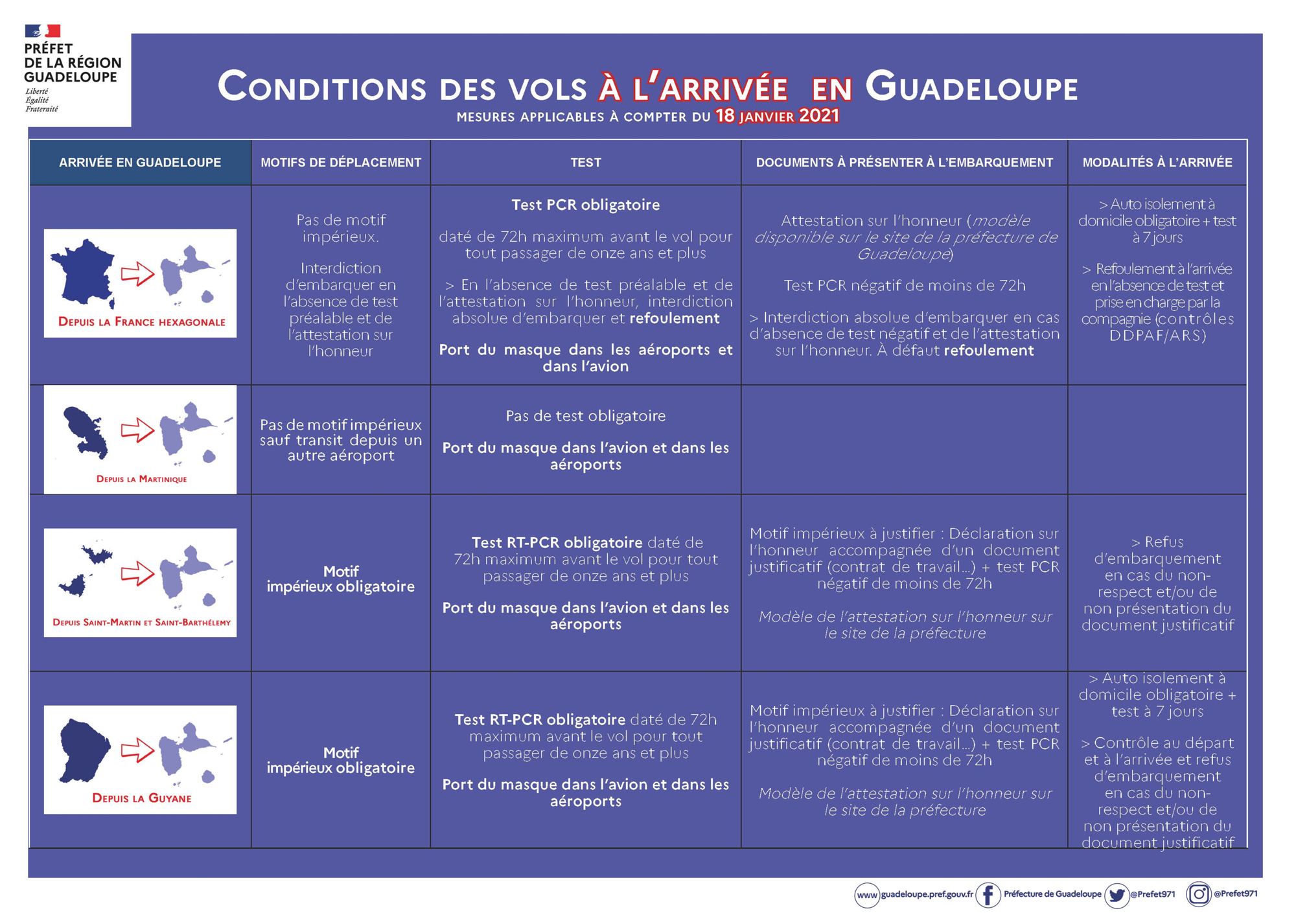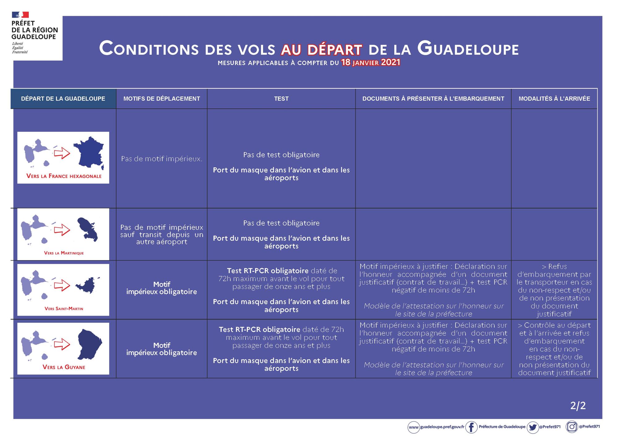 - Par ailleurs, les déplacements de personnes en provenance ou en direction de Saint-Martin,de Saint-Barthélemy, de la Guyane sont interdits sauf s’ils sont fondés sur un motif impérieux d’ordre personnel ou familial, un motif de santé relevant de l’urgence ou un motif professionnel ne pouvant être différé.