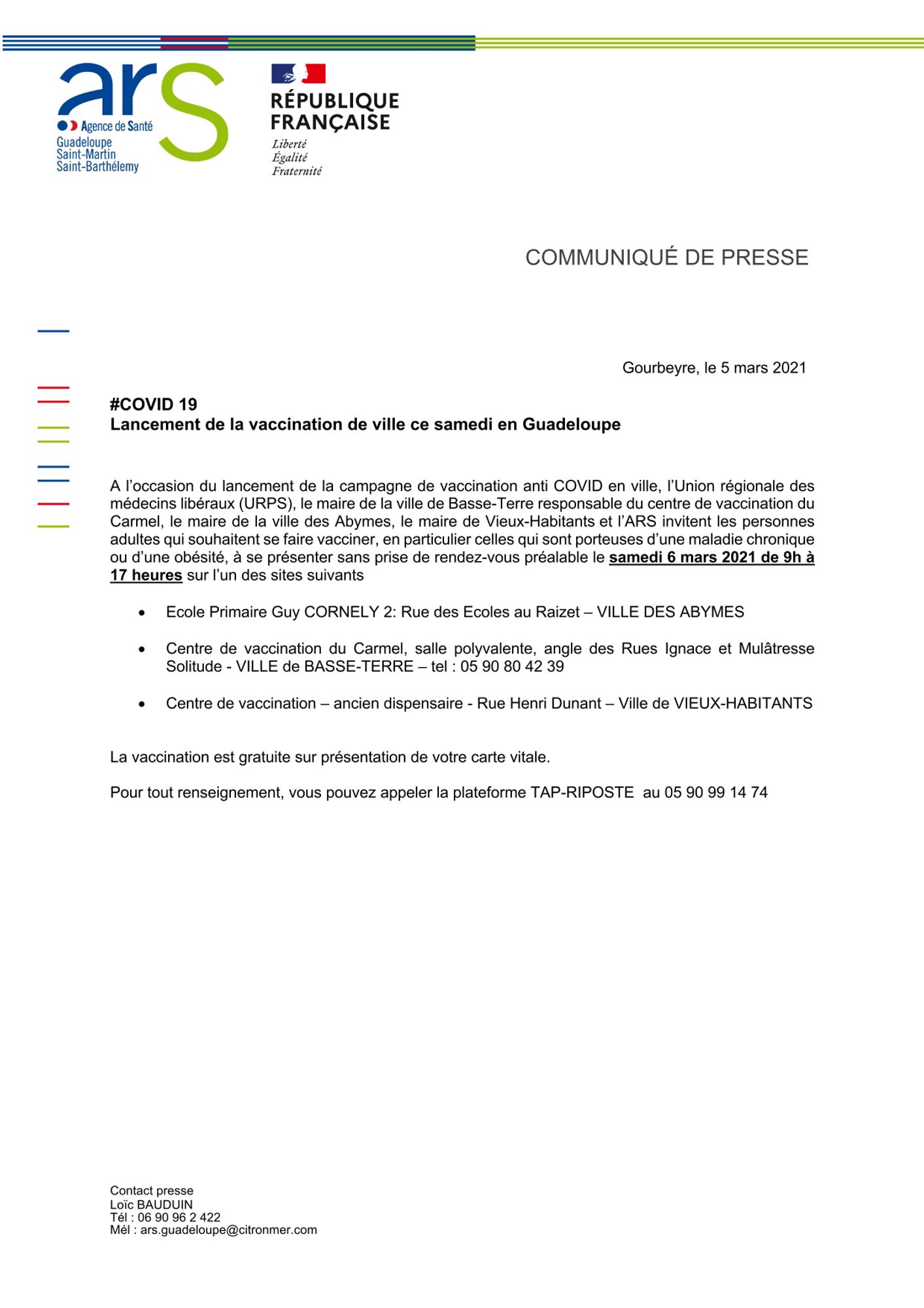 L'Agence de Santé de Guadeloupe Saint-Martin, Saint-Barthélemy annonce l'ouverture de 3 centres de vaccination destiné à ceux qui souhaitent se faire vacciner