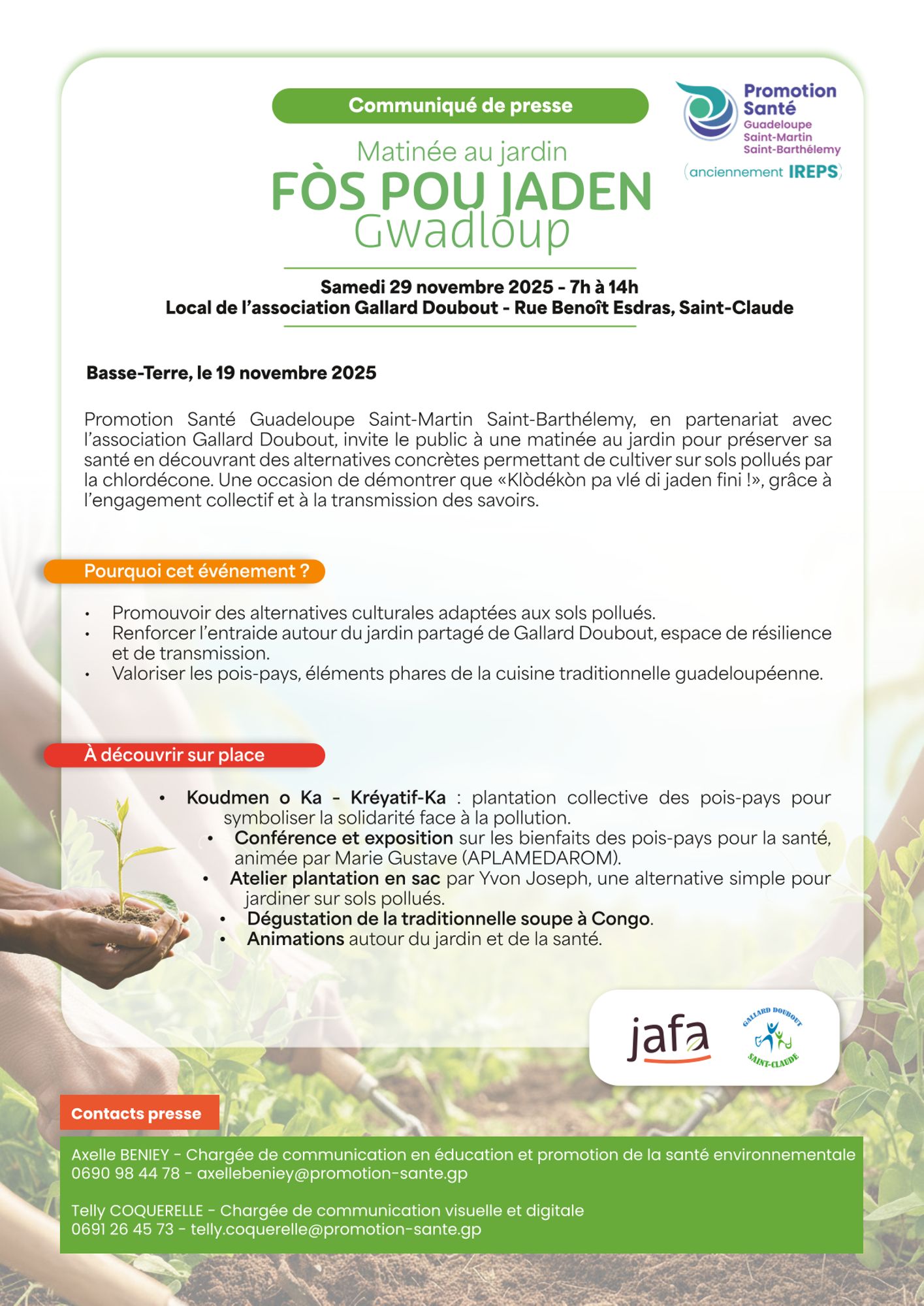 Organisée par Promotion Santé Guadeloupe, Saint-Martin et Saint-Barthélemy, en co-partenariat avec l'association Gaillard Doubout cette matinée au jardin à pour objectif de découvrir des alternatives concrètes permettant de cultiver sur sols pollués la chlordécone !
