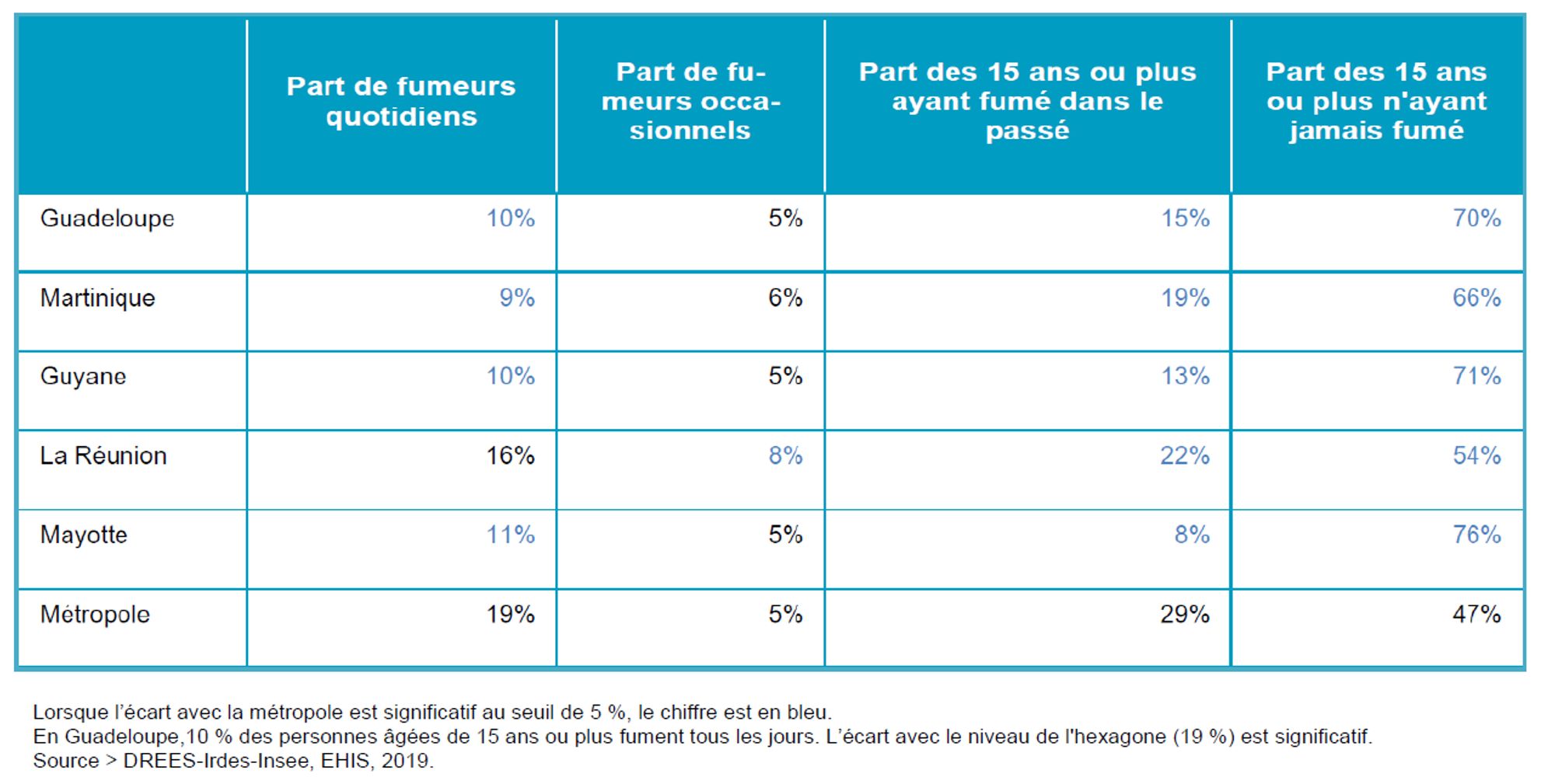 Le nombre estimé de fumeurs quotidiens est estimé en Guadeloupe à 40 000 ; les variables associées au tabagisme sont le sexe et l’âge mais ni le revenu, ni le niveau de diplôme ne sont associés au statut tabagique. Selon l’enquête Escapad (OFDT), le tabagisme quotidien chez les jeunes de 17 ans était de 11 % en Guadeloupe versus 25% au niveau national.