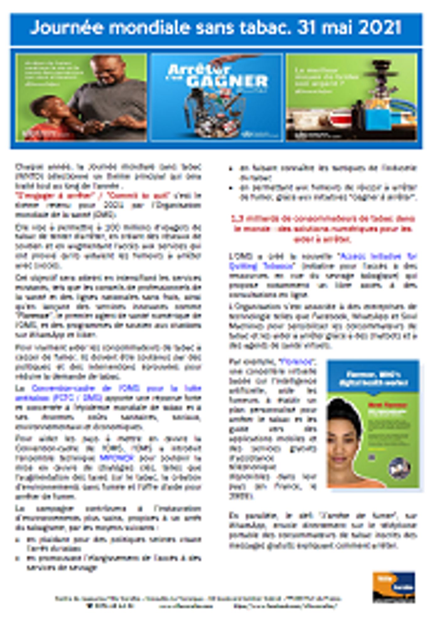 La Journée mondiale sans tabac de 2021 se penche sur l'arrêt du tabac dans le contexte sanitaire du COVID-19 avec pour thème principal "S'engager à arrêter ". Une campagne qui a pour objectif de soutenir, dans le monde entier, 100 millions de personnes qui tentent de renoncer au tabac. Elle doit contribuer à l’instauration d’environnements plus sains, propices à un arrêt du tabagisme, en :