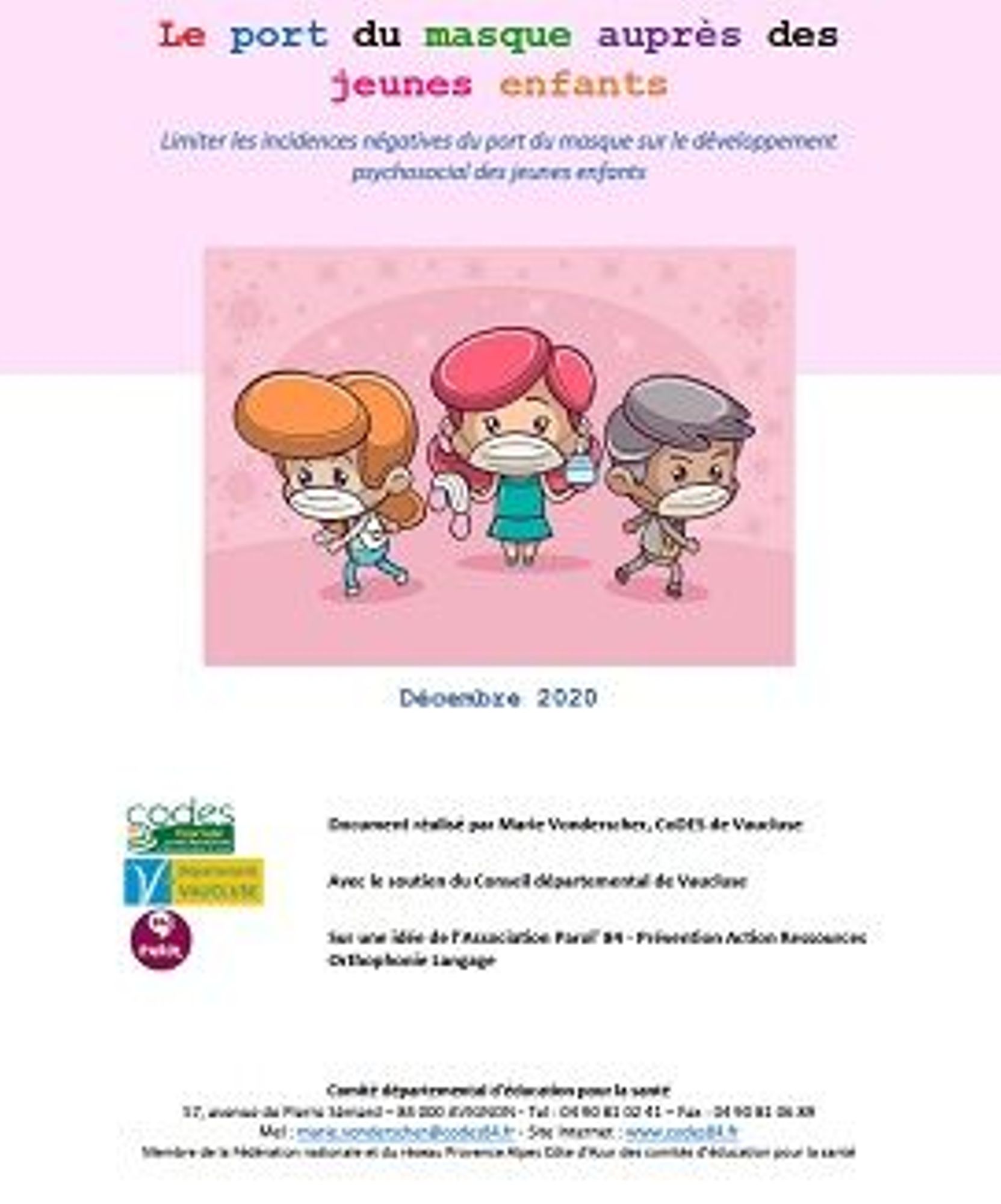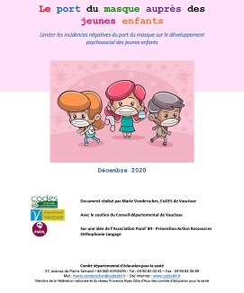 Ce livret a été créé afin de limiter les incidences négatives du port du masque sur le développement psychosocial des jeunes enfants. A l'intérieur on y trouve des ressources à destination des professionnels et des parents avec des propositions d'activités dans le but de dédramatiser le port du masque. L'aspect psychosocial est mis en avant et ce, dès le plus jeune âge.