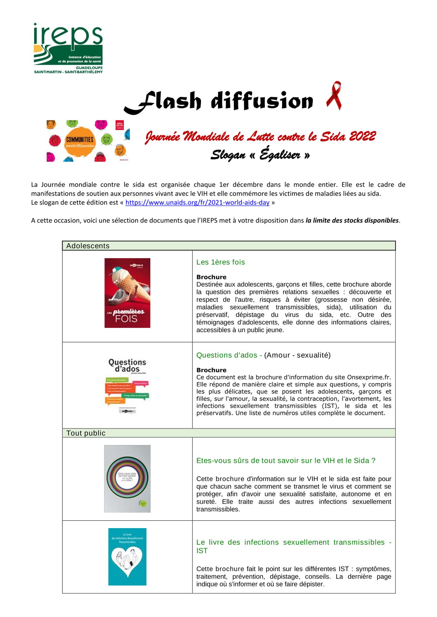 En amont de la Journée mondiale du 1er décembre et vous aider dans l'organisation de vos actions de prévention. L'Ireps Guadeloupe vous propose une liste de supports d'information sur la thématique.