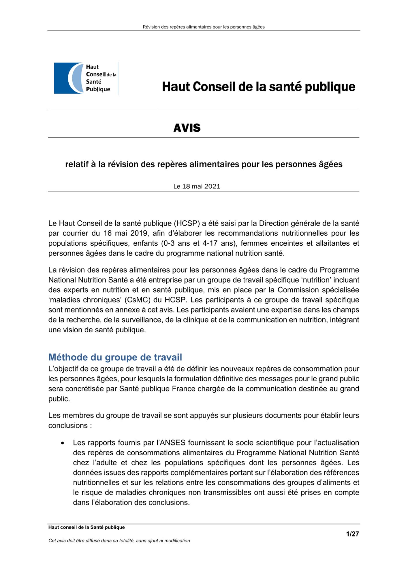 Le HCSP actualise les repères alimentaires du Programme national nutrition santé pour les personnes âgées. Ces nouveaux repères alimentaires vont servir de support pour l’élaboration des messages et la communication destinée au grand public élaborés par Santé publique France. Cet avis est ciblé pour les personnes âgées de plus de 75 ans, considérant les risques nutritionnels principaux à partir de cet âge que sont la dénutrition et la sarcopénie (déclin de la force et de la masse musculaire).