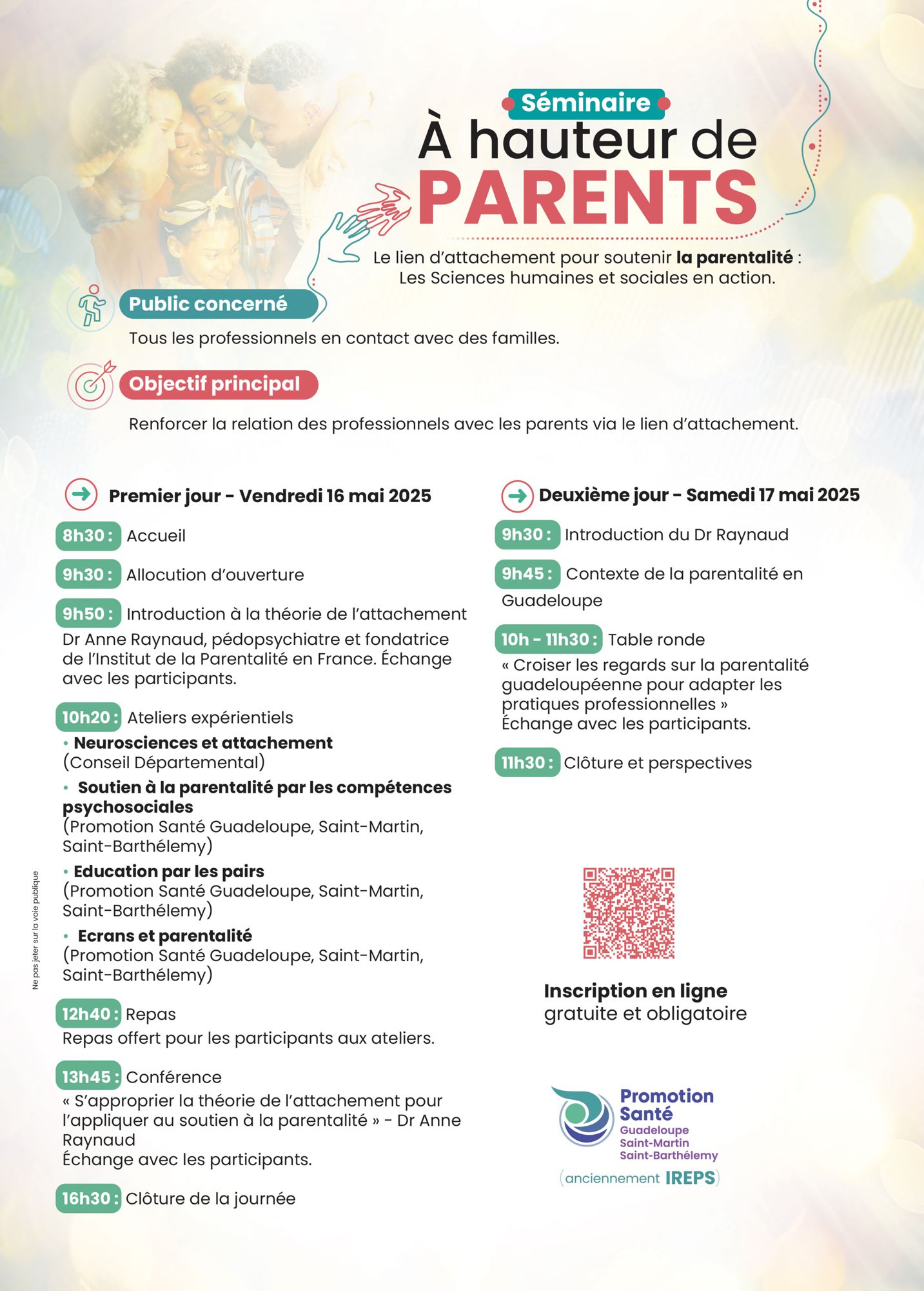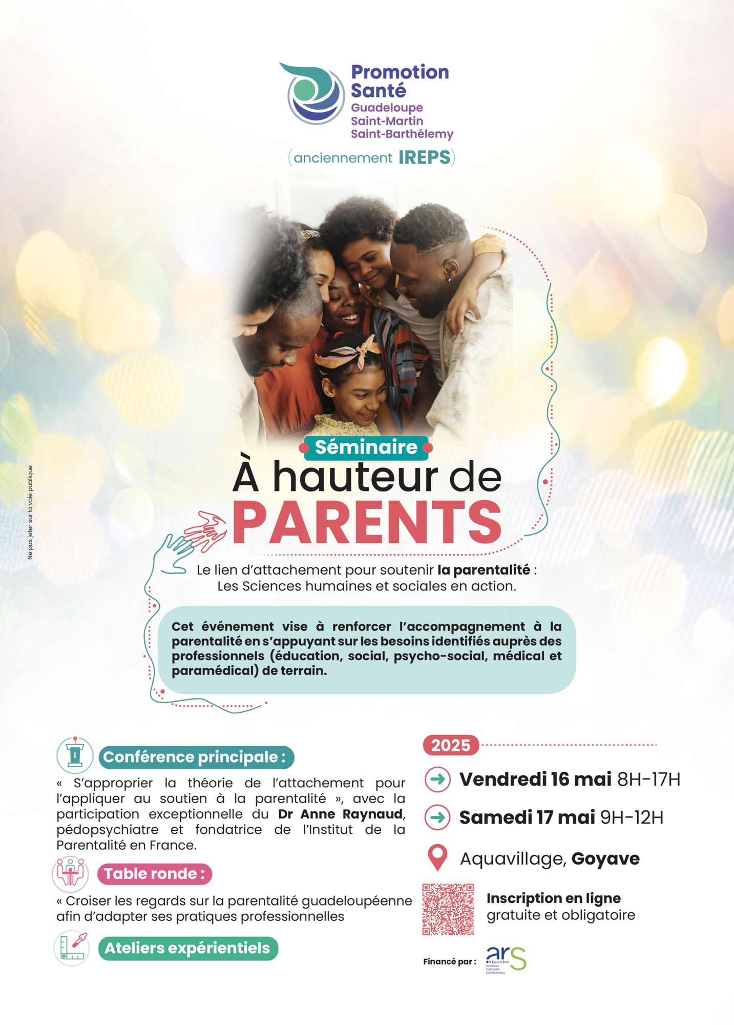 Promotion Santé Guadeloupe, Saint-Martin, Saint-Barthélemy (anciennement IREPS) organise un séminaire dédié au soutien à la parentalité les 16 et 17 mai 2025 .
