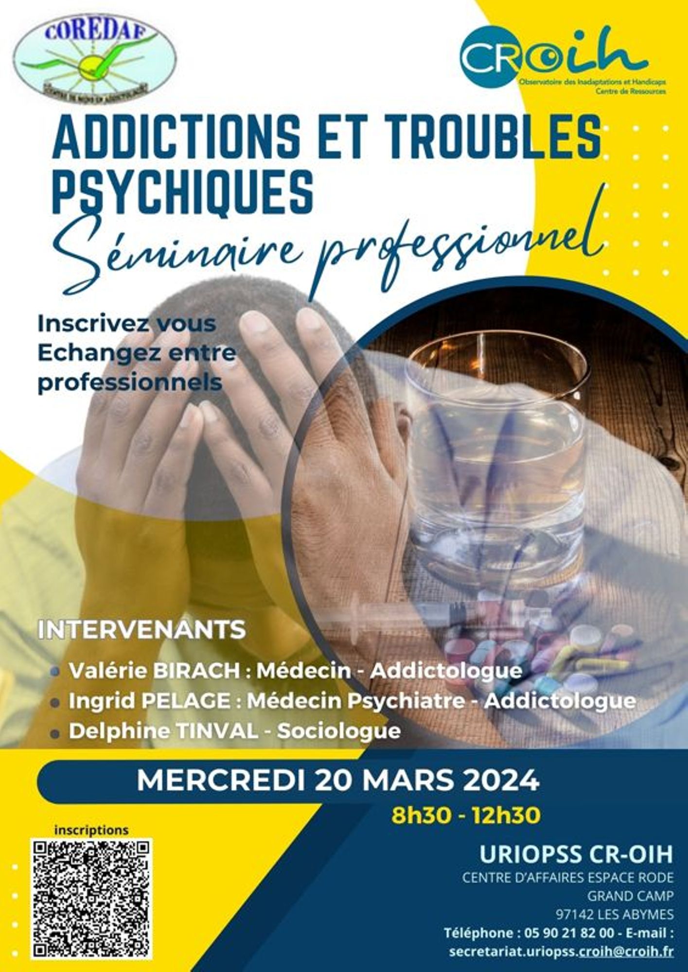 Séminaire professionnel « Addictions et maladie psychique » - URIOPSS / CR-OIH 20/03/2024 - URIOPSS / CR-OIH, Centre d'Affaires, Grand Camp Les Abymes Cliquer sur le lien Séminaire professionnel « Addictions et maladie psychique »