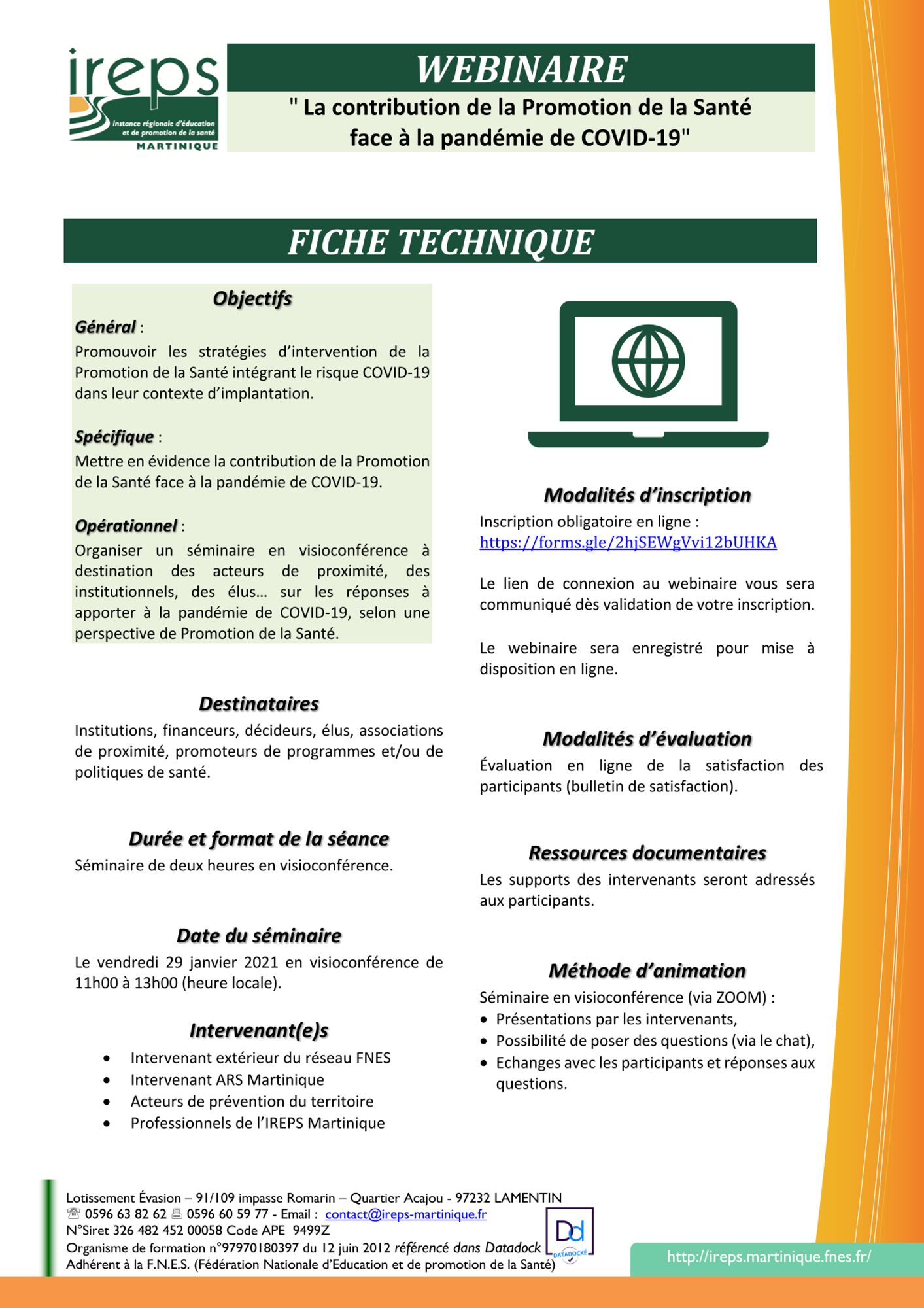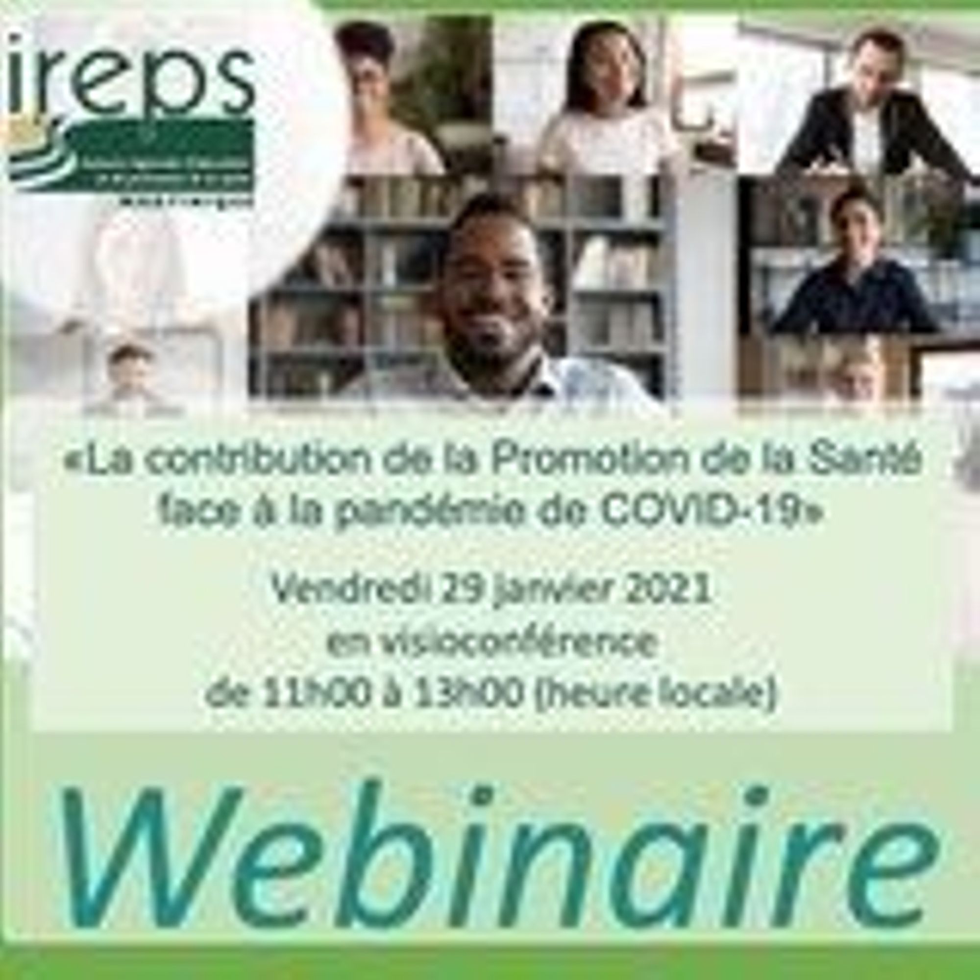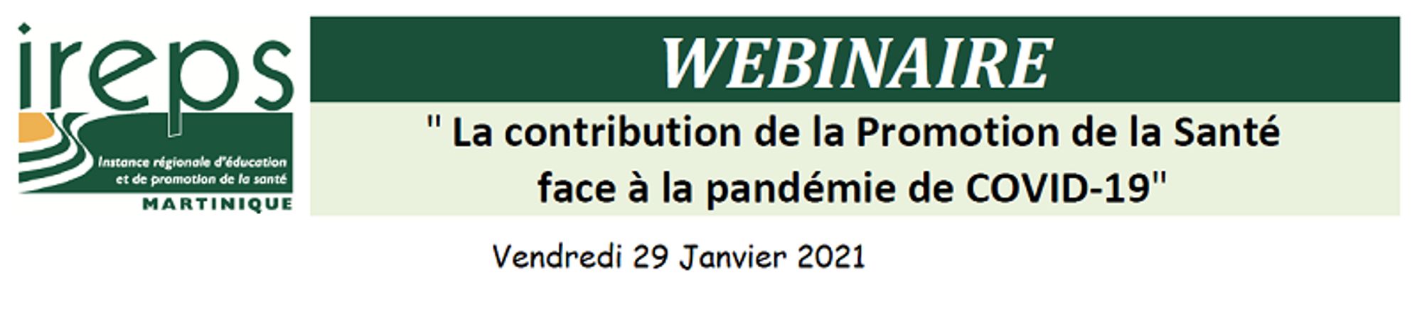 L’IREPS Martinique vous invite à participer à son Webinaire intitulé "La contribution de la Promotion de la Santé face à la pandémie de COVID-19" qui se tiendra le vendredi 29 janvier 2021 de 11h00 à 13h00 (heure de Martinique).