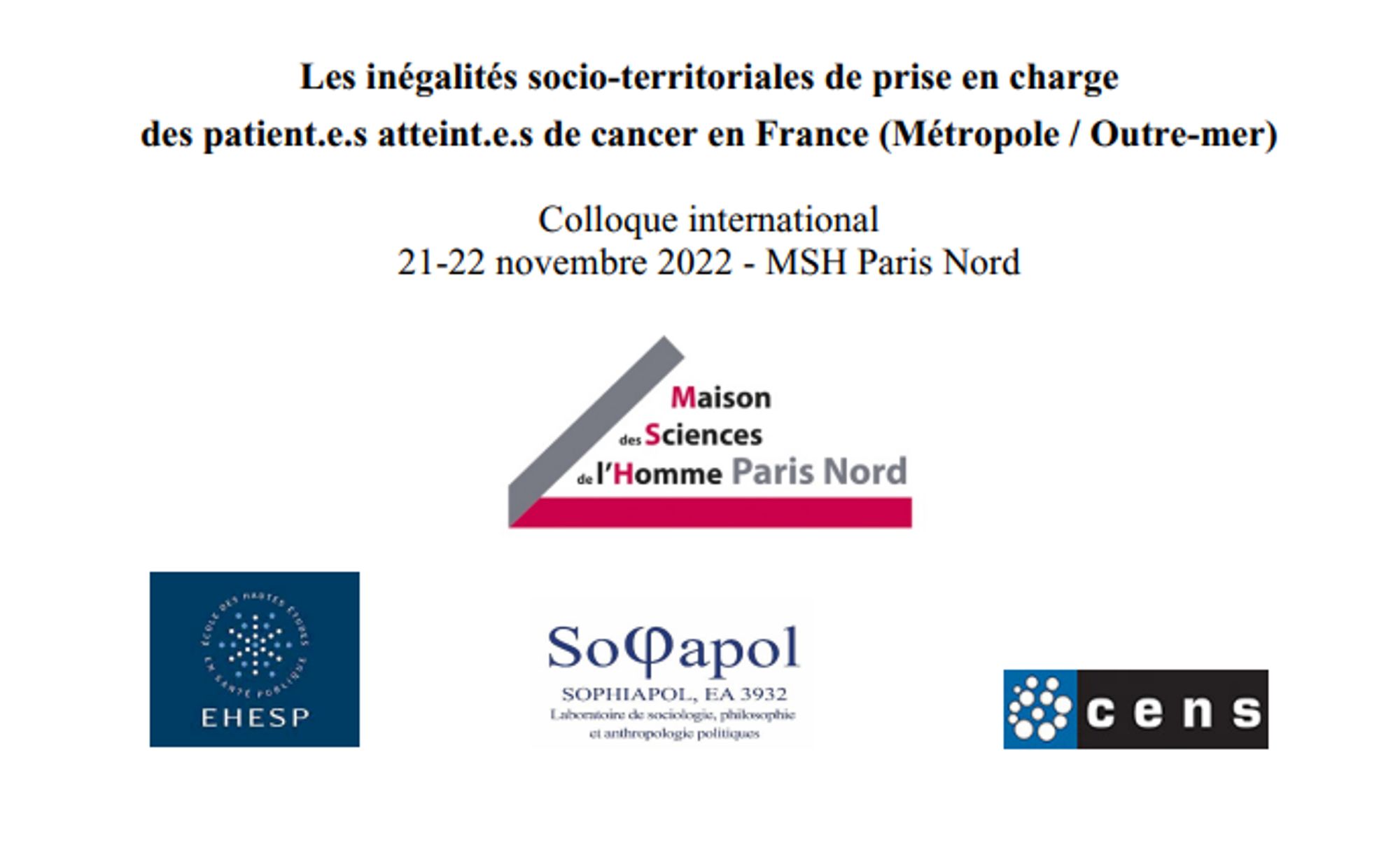A l’occasion de la clôture de l’étude collective CORSAC1 (2011-2022) centrée sur les parcours de soins comparés de 150 patient.e.s atteint.e.s de cancer en métropole, à la Réunion et à Mayotte, ce colloque internationalt organisé en partenariat par le CENS (UMR 6025, Université de Nantes) et le SOPHIAPOL (EA3932, Université Paris-Nanterre) se déroulera sur le site de la MSH- Paris Nord, les 24 et 25 novembre 2022. Il s’agira d’élargir la focale de cette étude afin de comprendre comment ses résultats entrent en résonance avec d’autres travaux portant sur le cancer, mais aussi sur d’autres pathologies chroniques et d’autres terrains métropolitains et ultra-marins concernant les inégalités sociales et géographiques de santé.