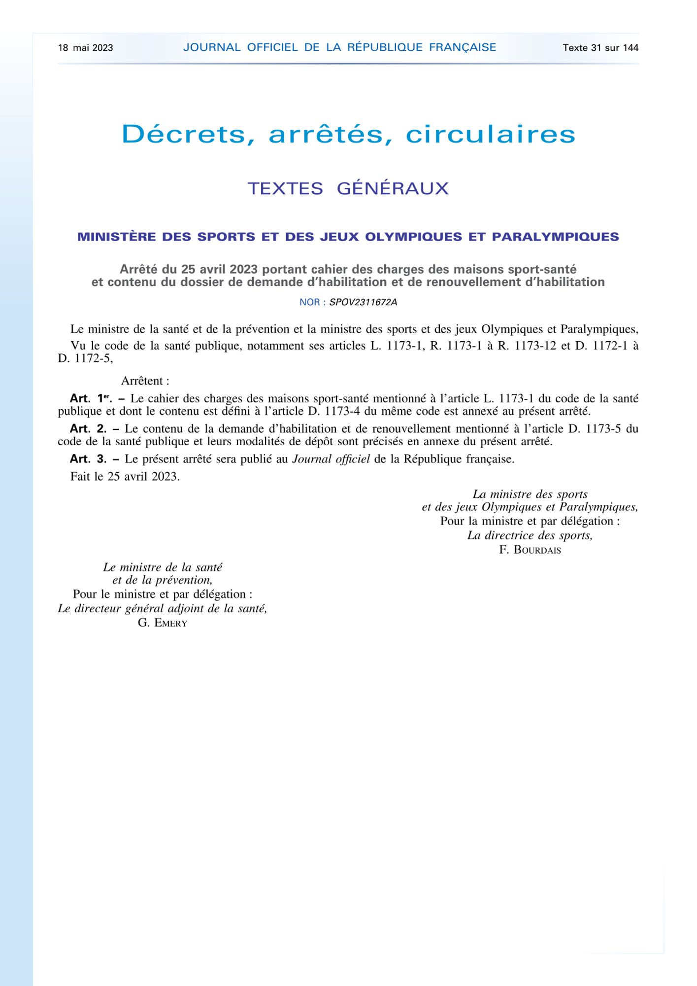Arrêté du 25 avril 2023 portant cahier des charges des maisons sport-santé et contenu du dossier de demande d'habilitation et de renouvellement d'habilitation