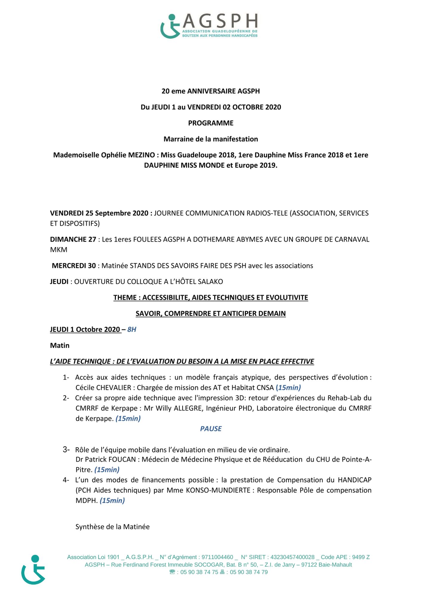 Colloque AGSPH "aides techniques,accessibilité du cadre bâti, inclusion professionnelle et sociale des personnes en situation de handicap"- 1 & 2 octobre 2020 - GOSIER