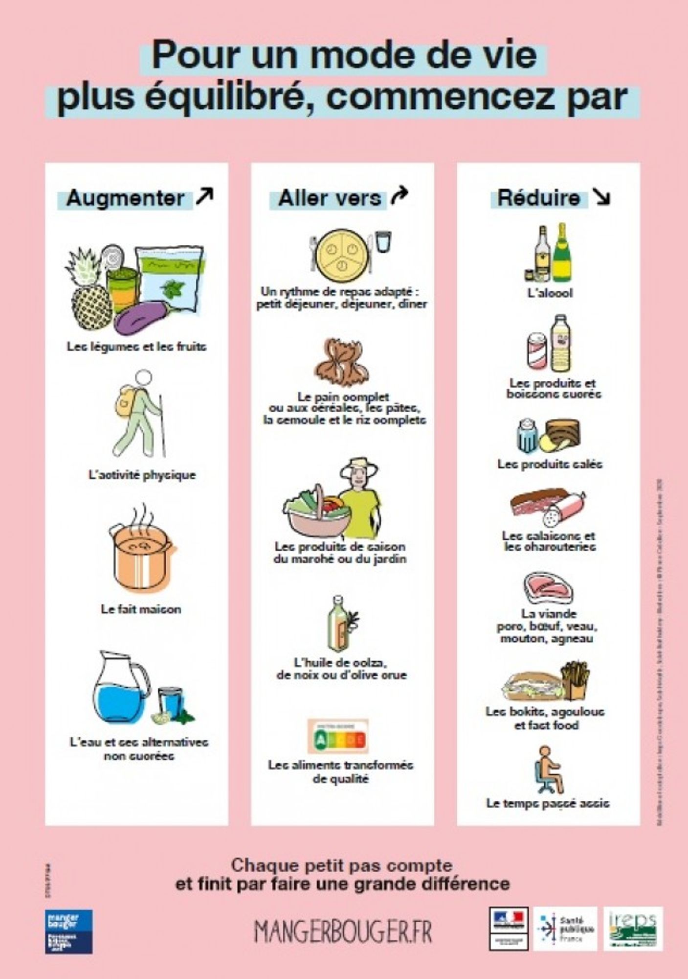 Réadaptée au contexte local, cette affiche présente les nouvelles recommandations pour la population adulte concernant l'alimentation, l'activité physique et la sédentarité. Elle invite le consommateur à modifier ses habitudes et ses choix, progressivement et à son rythme, autour de trois notions : Augmenter / Aller vers / Réduire.