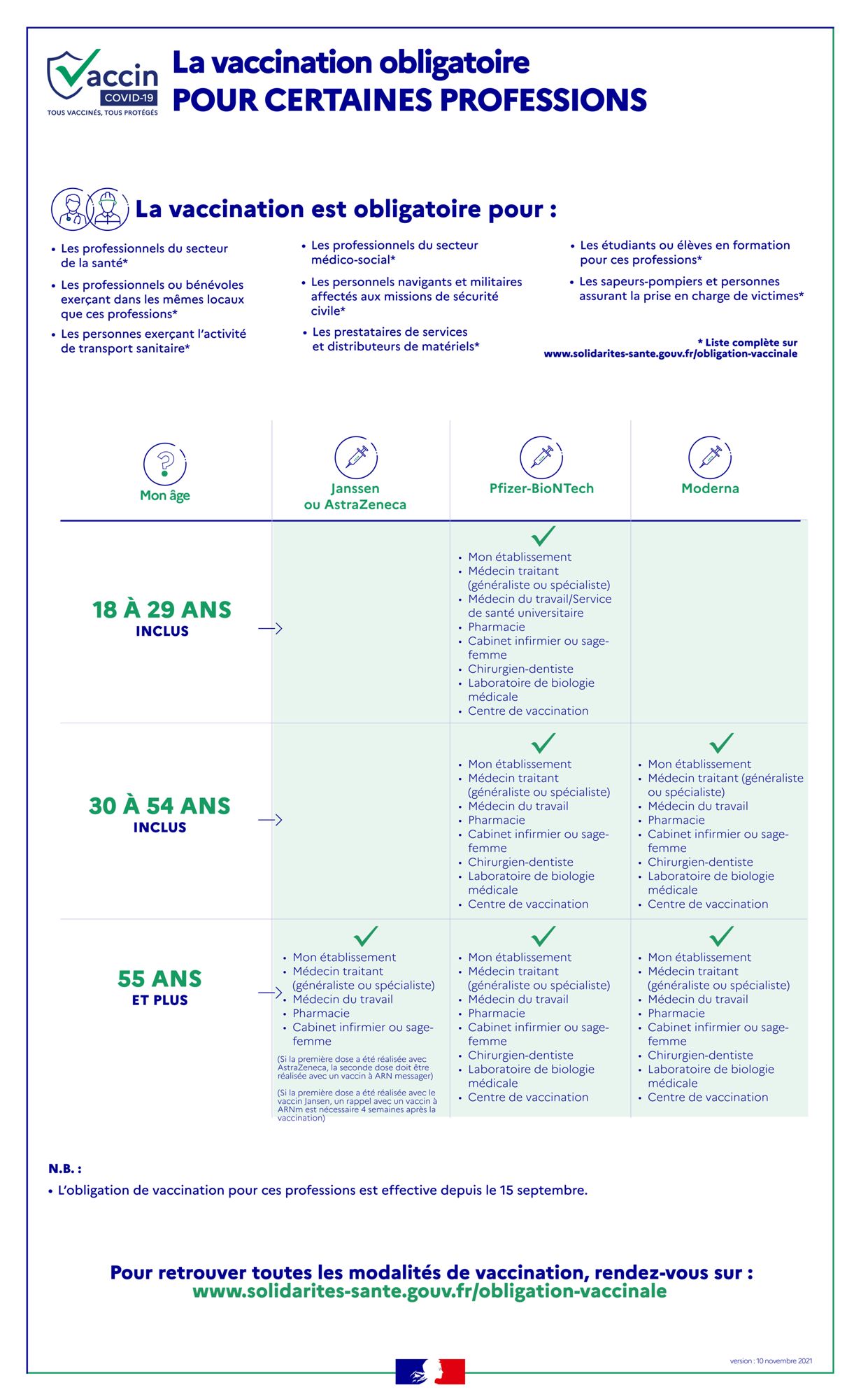 Obligations vaccinales Infographies Santé publique France - 10/11/2021 Infographie - La vaccination obligatoire pour certaines professions (74.5 Ko) Infographie - La vaccination pour le grand public (100.0 Ko) Source: Ministère des Solidarités et de la santé/ Santé publique France (10/11/2021) Liste des obligations vaccinales - Ministère de la Santé et des solidarités